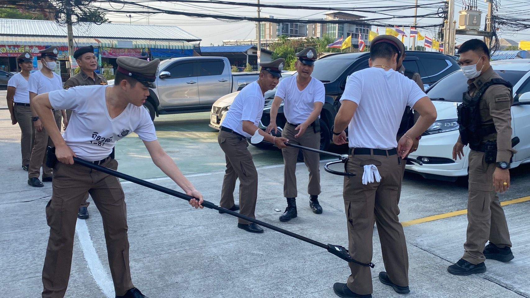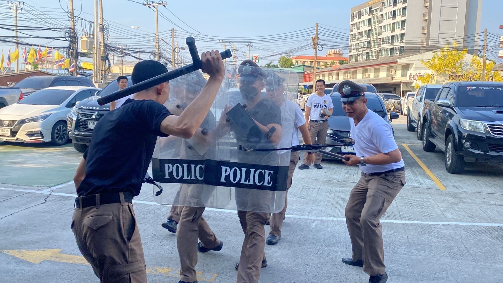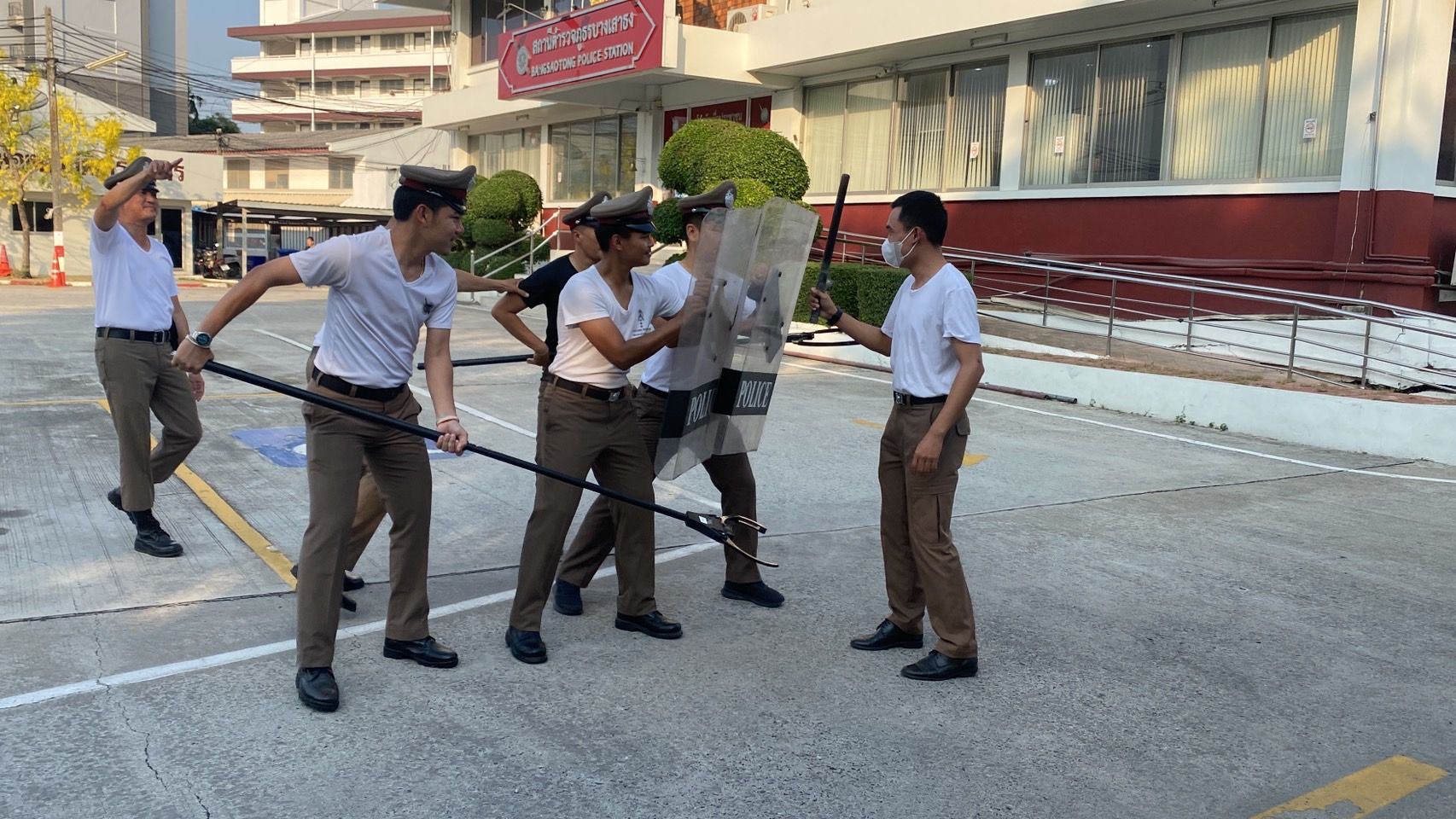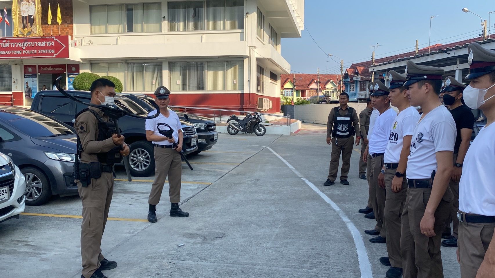 ฝึกประจำสัปดาห์ ให้กับข้าราชการตำรวจ สภ.บางเสาธง และฝึกยุทธวิธีตำรวจ การใช้ไม้ง่ามไฟฟ้า ปืนไฟฟ้าเข้าระงับเหตุบุคคลคลุ้มคลั่ง