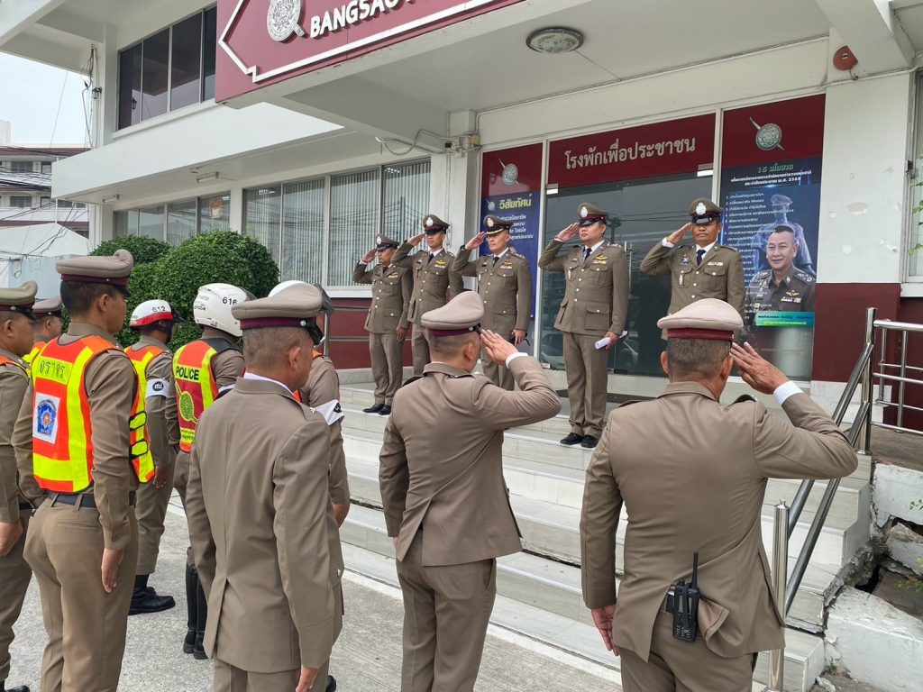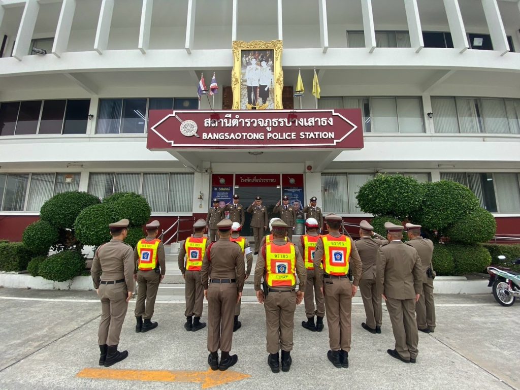 พ.ต.อ.โสภณ มงคลโสภณรัตน์ ผกก.สภ.บางเสาธง พ.ต.ท.ศรายุทธ บุญแจ่ม รอง ผกก.ป.ฯ พ.ต.ท.สันติ พงศ์สระพัง สว.อก. พ.ต.ต.สุรัตศักดิ์ เสียบไธสง สวป.ฯ พร้อมกำลังเจ้าหน้าที่ตำรวจ สภ.บางเสาธง