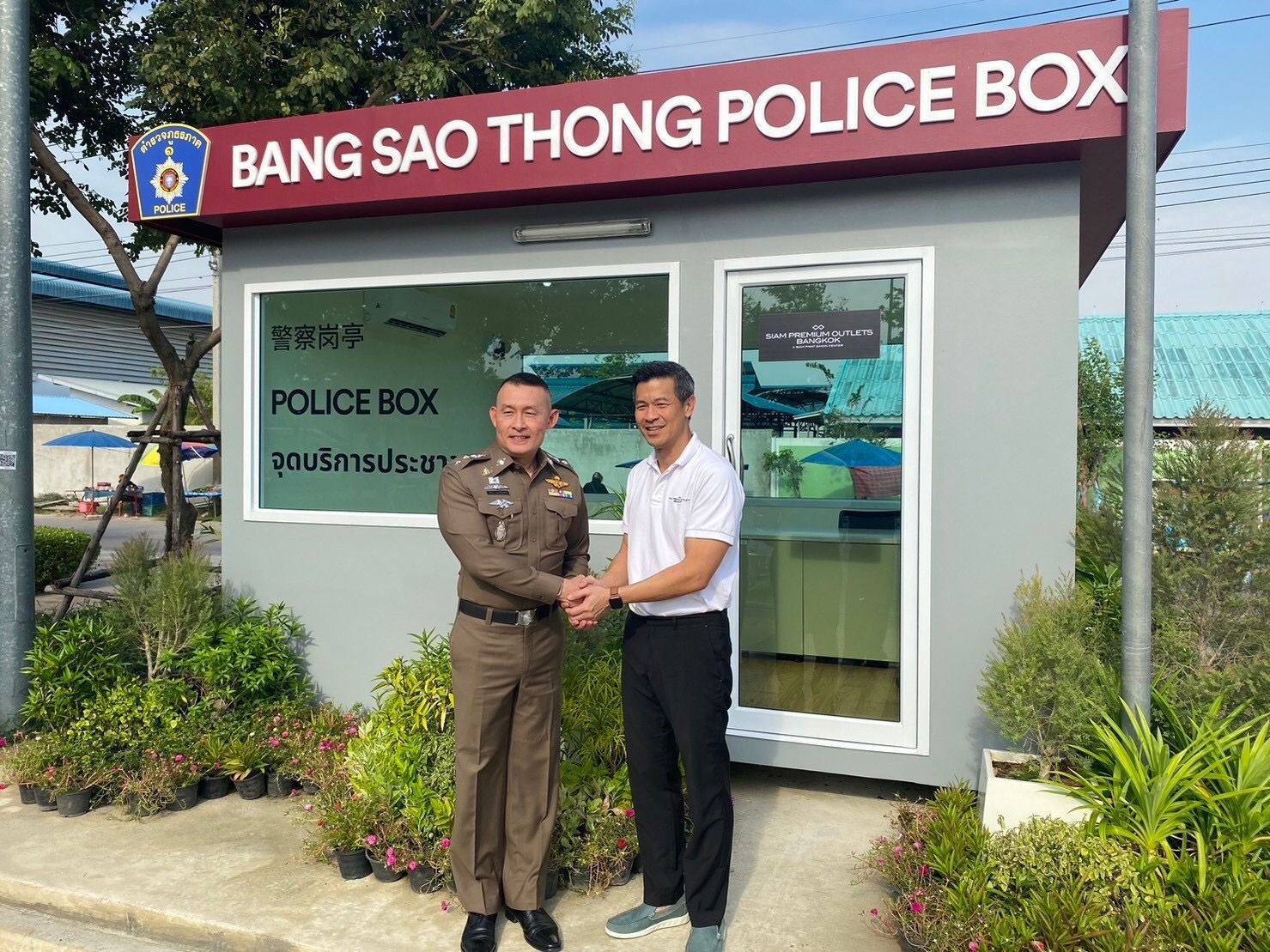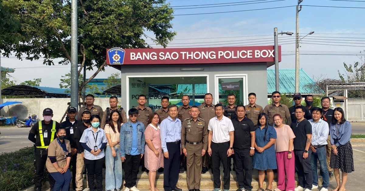 วันนี้25 ม.ค. 2567 เวลา 09.00 น. พ.ต.อ.โสภณ มงคลโสภณรัตน์ ผกก.สภ.บางเสาธง พ.ต.ท.ราเชนทร์ ถนัดพจนามาตย์ รอง ผกก.ป.ฯ พ.ต.ท.ธีรพันธ์ ทบสมัย สวป.ฯ พ.ต.ต.สุรัตศักดิ์ เสียบไธสง สวป.ฯ พร้อมเจ้าหน้าที่ตำรวจงานป้องกันปราบปราม สภ.บางเสาธง ร่วมกันรับมอบตู้ยามที่พักสายตรวจ จากบริษัท สยามพิวรรธน์ ไซม่อน จำกัด(สยามพรีเมี่ยม เอาท์เล็ท) โดยมีนายไมเคิล ถัง กรรมการผู้จัดการ รวมทั้งผู้บริหาร และพนักงานบริษัทฯ เป็นตัวแทนส่งมอบตู้ยามที่พักสายตรวจ ณ ห้างสรรพสินค้า สยามพรีเมี่ยม เอาท์เลต