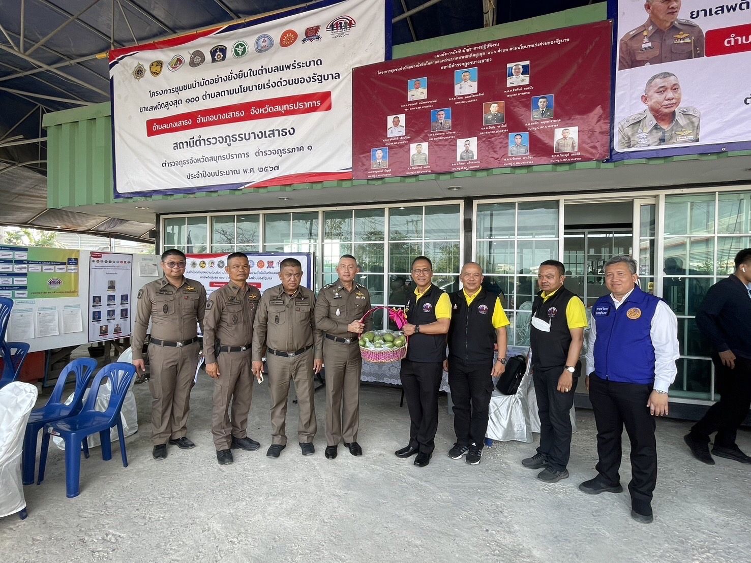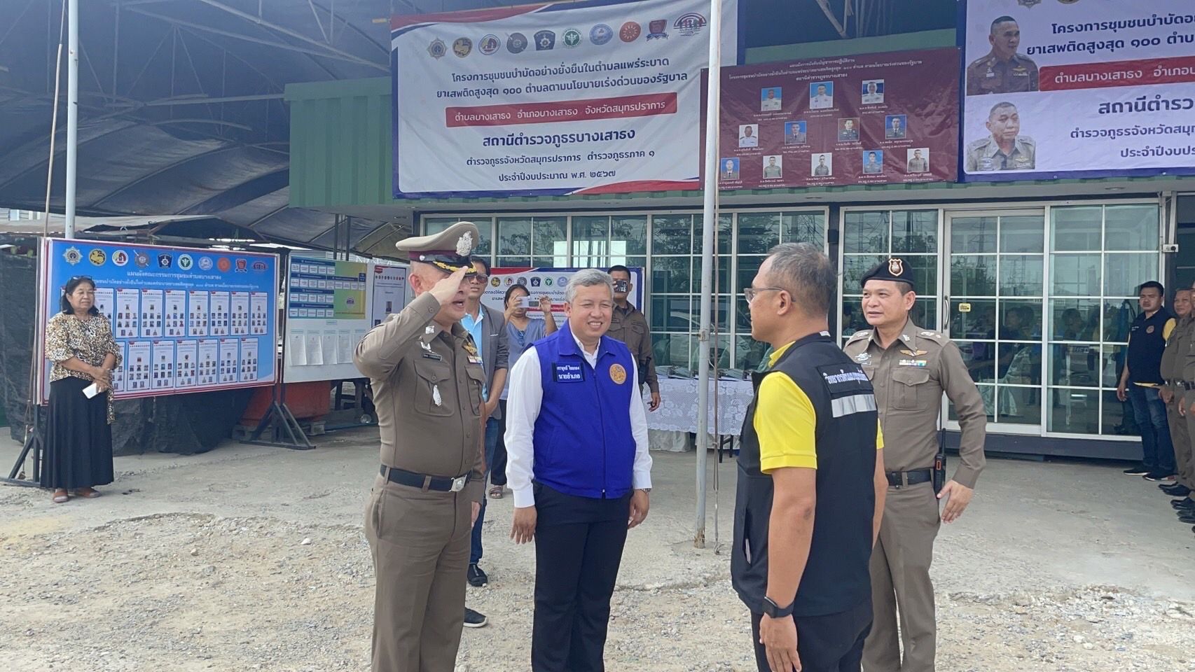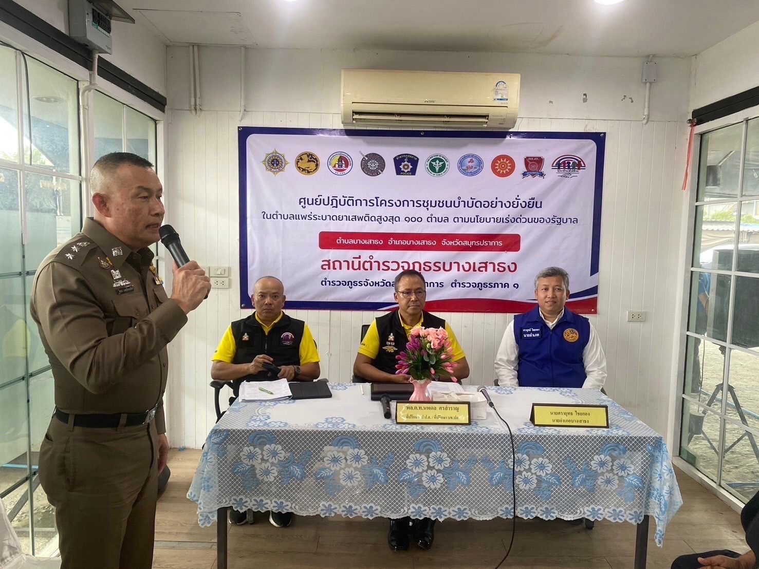 วันที่ 26 ก.พ. 67 เวลา 10.00 น. พล.ต.ท.นพดล ศรสำราญ ที่ปรึกษา ป.ป.ส./ที่ปรึกษา บช.ปส. พร้อมคณะกรรมการตรวจประเมินสรุปผลการตรวจและให้คำแนะนำ ในการดำเนินงานโครงการชุมชนบำบัดอย่างยั่งยืนในตำบลแพร่ระบาดยาเสพติดสูงสุด 100 ตำบลตามนโยบายเร่งด่วนของรัฐบาล ในพื้นที่ ต.บางเสาธง อ.บางเสาธง จ.สมุทรปราการโดยมี นายศรายุทธ ไชยกอง นายอำเภอบางเสาธง พ.ต.อ.โสภณ มงคลโสภณรัตน์ ผกก.สภ.บางเสาธง , พ.ต.ท.ราเชนทร์ ถนัดพจจนามาตย์ รองผกก.ป.ฯ , พ.ต.ท.ธีรพันธ์ ทบสมัย สวป.ฯ , พ.ต.ต.สุรัตศักดิ์ เสียบไธสง สวป.(ชส.)ฯ พร้อมชุดปฏิบัติการชุมชนยั่งยืน และข้าราชการตำรวจ สภ.บางเสาธง , กต.ตร. สภ.บางเสาธง , ฝ่ายปกครอง , องค์กรปกครองส่วนท้องถิ่น , สาธารณสุข , พัฒนาชุมชน , ผู้นำชุมชน , ภาคีเครือข่ายทั้งภาครัฐและเอกชน ให้การต้อนรับ โดยตรวจเยี่ยมชุมชนดังนี้